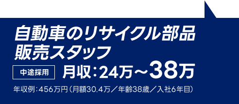 | 募集職種名 | 自動車のリサイクル部品販売スタッフ|未経験OK/プライベートが充実する安定企業/品川駅徒歩5分/30代活躍中! |
